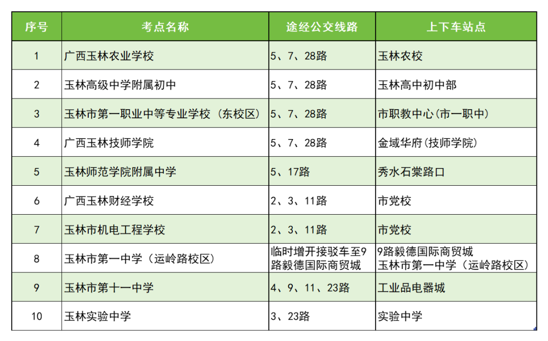 9路毅德國(guó)際商貿(mào)城站點(diǎn)7:30-9:00,13:00-14:00 在站點(diǎn)安排車(chē)輛和值勤人員,負(fù)責(zé)將考生送到玉林市第一中學(xué)(運(yùn)嶺路校區(qū))考點(diǎn)。