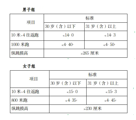 參照《關于印發(fā)公安機關錄用人民警察體能測評項目和標準(暫行)的通知》(人社部發(fā)〔2011〕48號)的項目及測試規(guī)則,結合《公安民警體育鍛煉達標手冊》成績標準,本次體能測評的項目和標準如下: