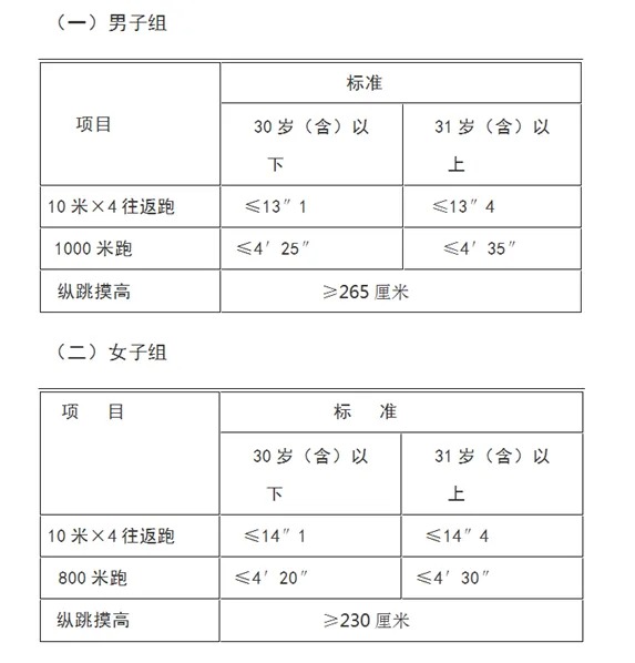 報(bào)考人員須參加全部三項(xiàng)體能測評,全部達(dá)標(biāo)方為合格,如放棄一項(xiàng)則視為不合格,體能測評合格的方可進(jìn)入下一環(huán)節(jié)。