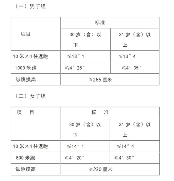 4.報考人員須參加全部三項體能測評,全部達標(biāo)方為合格,如放棄一項則視為不合格,體能測評合格的方可進入下一環(huán)節(jié)。