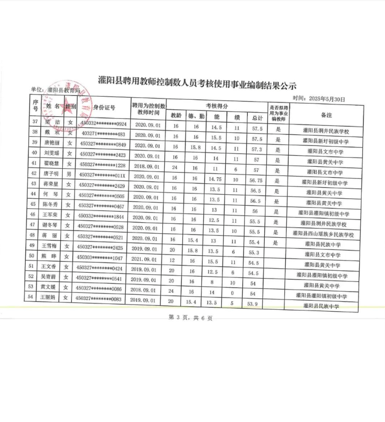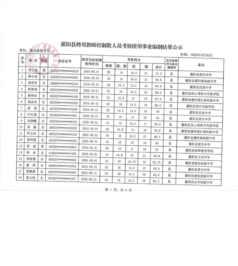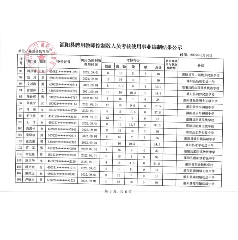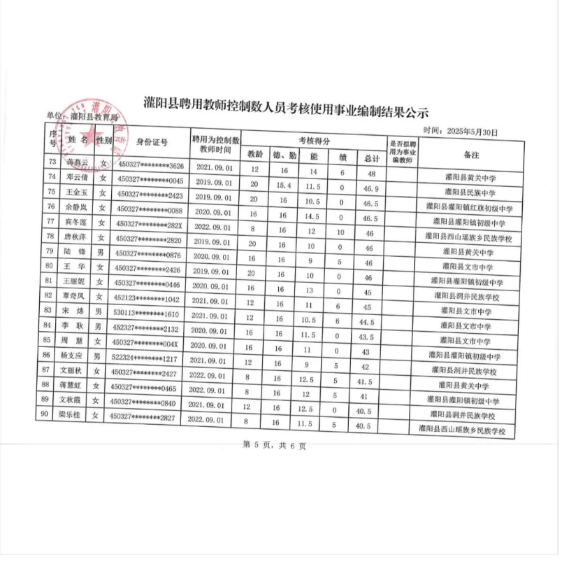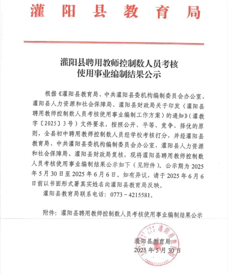灌陽縣聘用教師控制數(shù)人員考核使用事業(yè)編制結(jié)果公示
