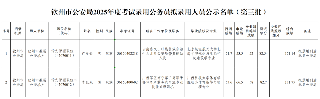 15 欽州市2025年度考試錄用公務(wù)員擬錄用人員公示(七)