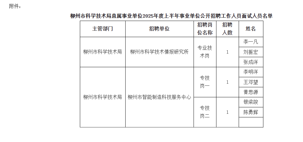 附件:柳州市科學(xué)技術(shù)局直屬事業(yè)單位2025年度上半年事業(yè)單位公開(kāi)招聘工作人員面試人員名單
