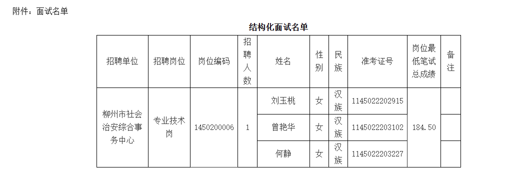 根據(jù)《2025年度柳州市事業(yè)單位公開考試招聘工作人員公告》、《關于印發(fā)〈廣西壯族自治區(qū)事業(yè)單位公開招聘工作人員面試工作規(guī)則(試行)〉的通知》(桂人社發(fā)〔2012〕79號)的規(guī)定,中共柳州市委政法委員會擬組織所屬年事業(yè)單位公招面試,現(xiàn)將相關事宜公告如下: