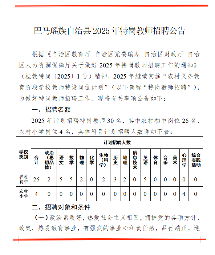 原文標題:巴馬瑤族自治縣2025年特崗教師招聘公告