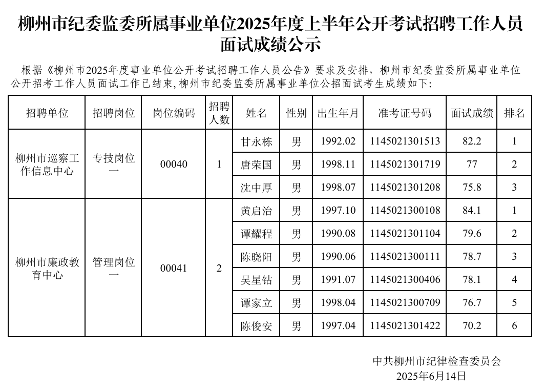 原文標題:柳州市紀委監(jiān)委所屬事業(yè)單位2025年度上半年公開考試招聘工作人員面試成績公示