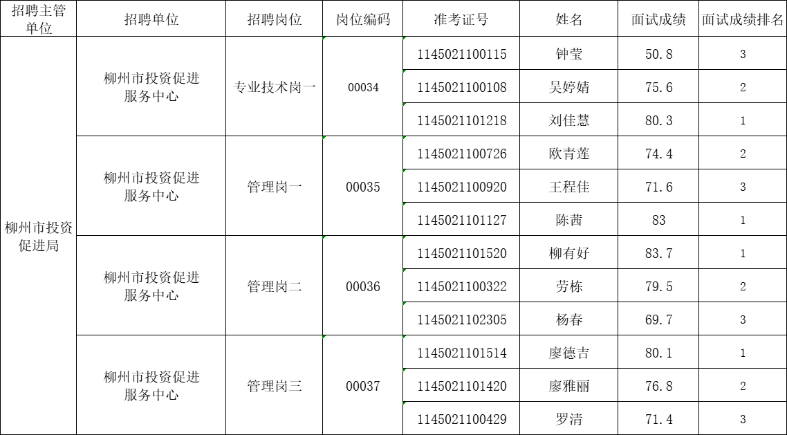 根據(jù)《2025年度柳州市事業(yè)單位公開考試招聘工作人員公告》要求及安排,柳州市投資促進局所屬事業(yè)單位公開招聘工作人員面試工作已結束,面試考生成績如下: