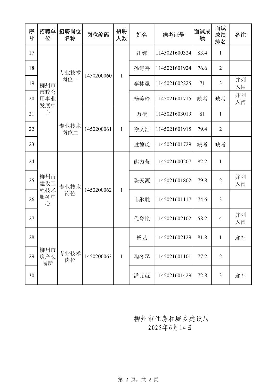 柳州市住房和城鄉(xiāng)建設(shè)局所屬事業(yè)單位2025年度上半年公開考試招聘工作人員面試成績公示