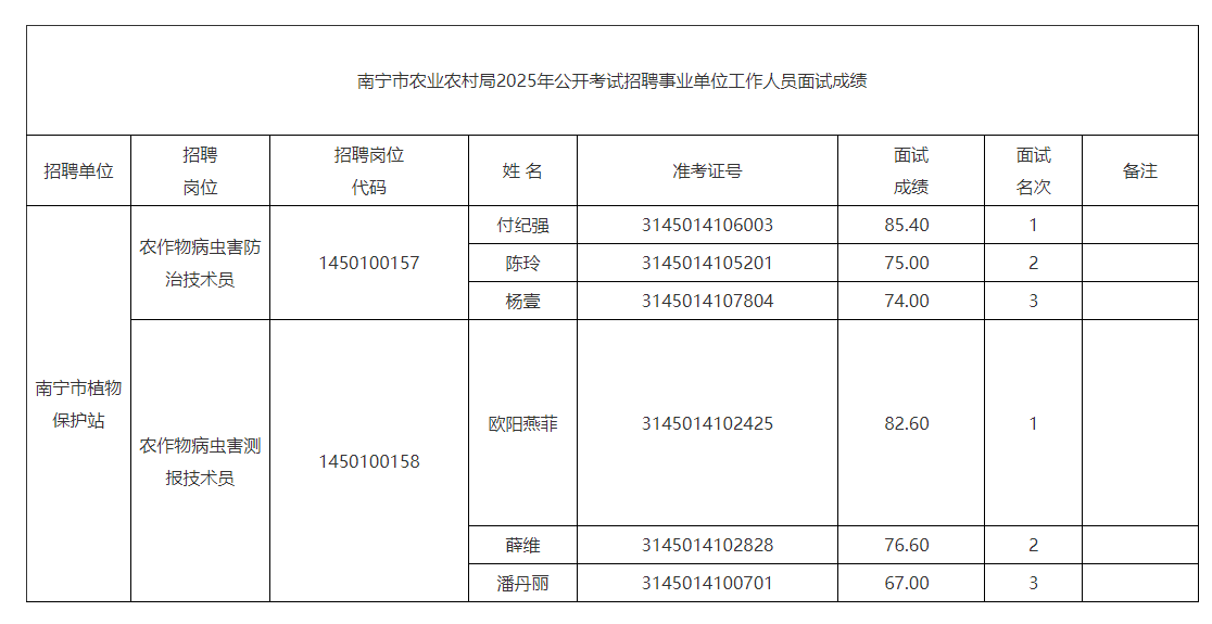 南寧市農(nóng)業(yè)農(nóng)村局2025年公開考試招聘事業(yè)單位工作人員面試成績(jī)