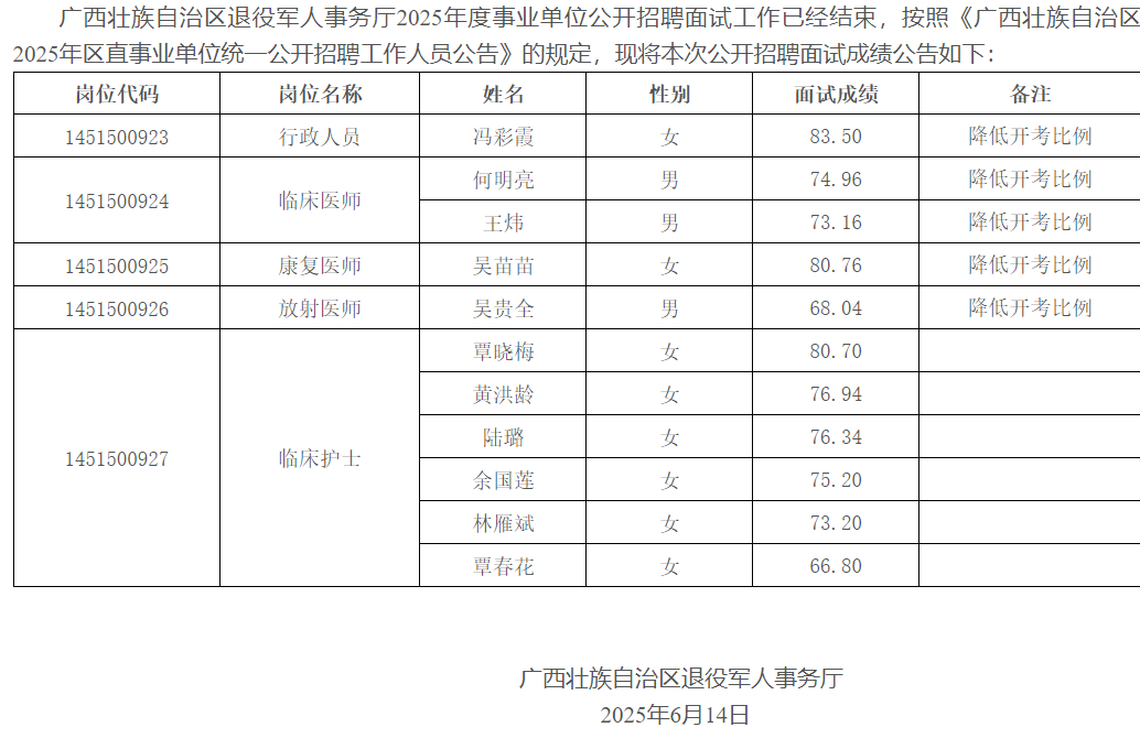 廣西壯族自治區(qū)退役軍人事務(wù)廳關(guān)于發(fā)布2025年度事業(yè)單位公開招聘面試成績的公告