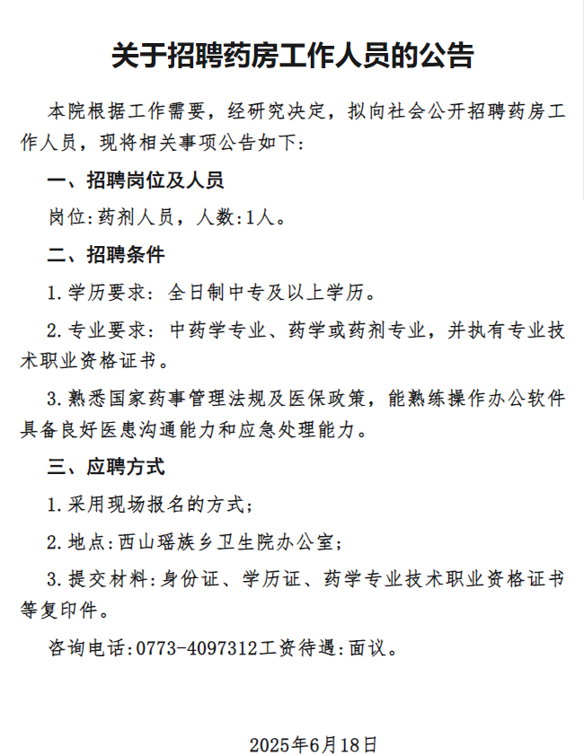 原文標題:灌陽縣西山瑤族鄉(xiāng)衛(wèi)生院關(guān)于招聘藥房工作人員的公告