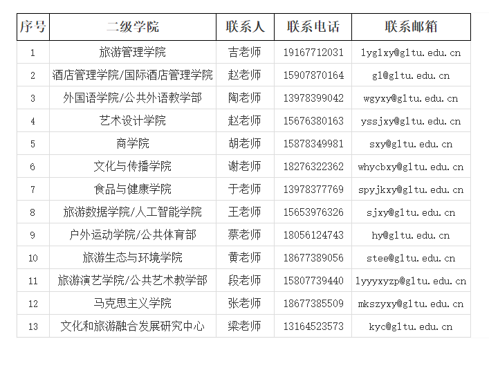 聯(lián)系地址:廣西桂林市雁山區(qū)良豐路26號(hào)桂林旅游學(xué)院人事處 郵 編:541006  聯(lián)系人:鄧?yán)蠋?/p>