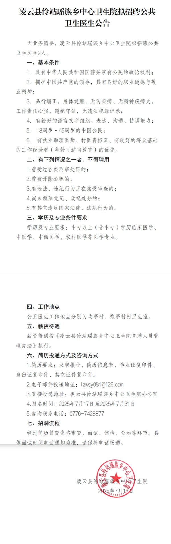 2025年凌云縣伶站瑤族鄉(xiāng)中心衛(wèi)生院擬招聘公共衛(wèi)生醫(yī)生2人