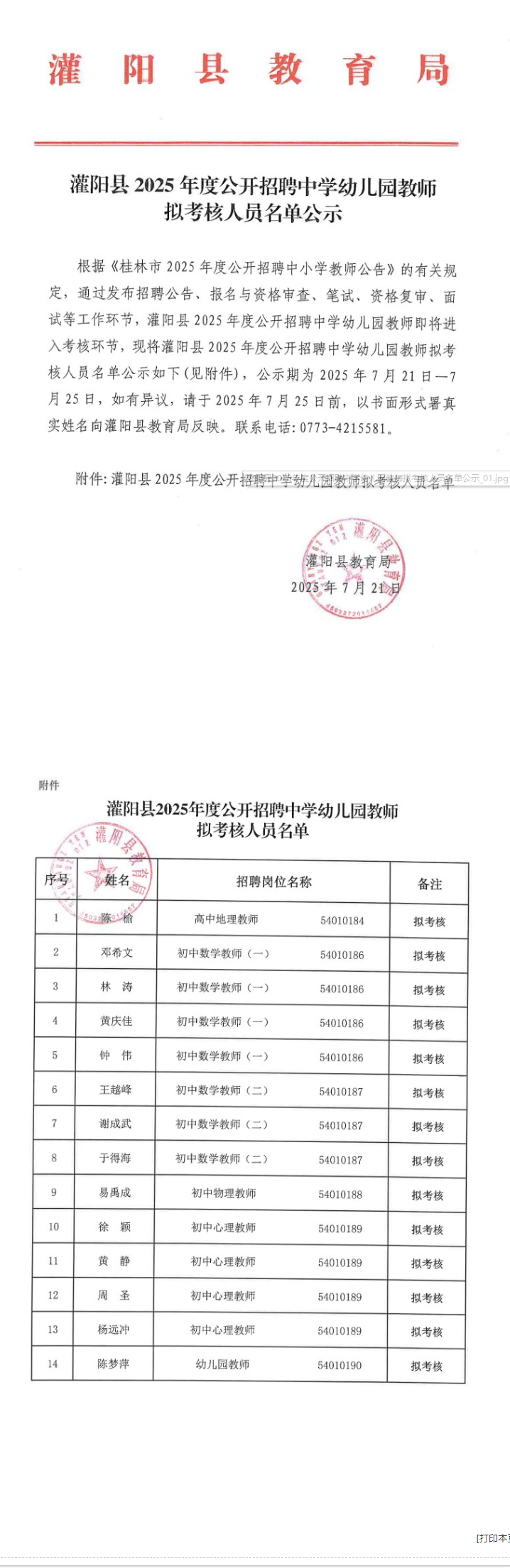 灌陽(yáng)縣2025年度公開招聘中學(xué)幼兒園教師擬考核人員名單公示