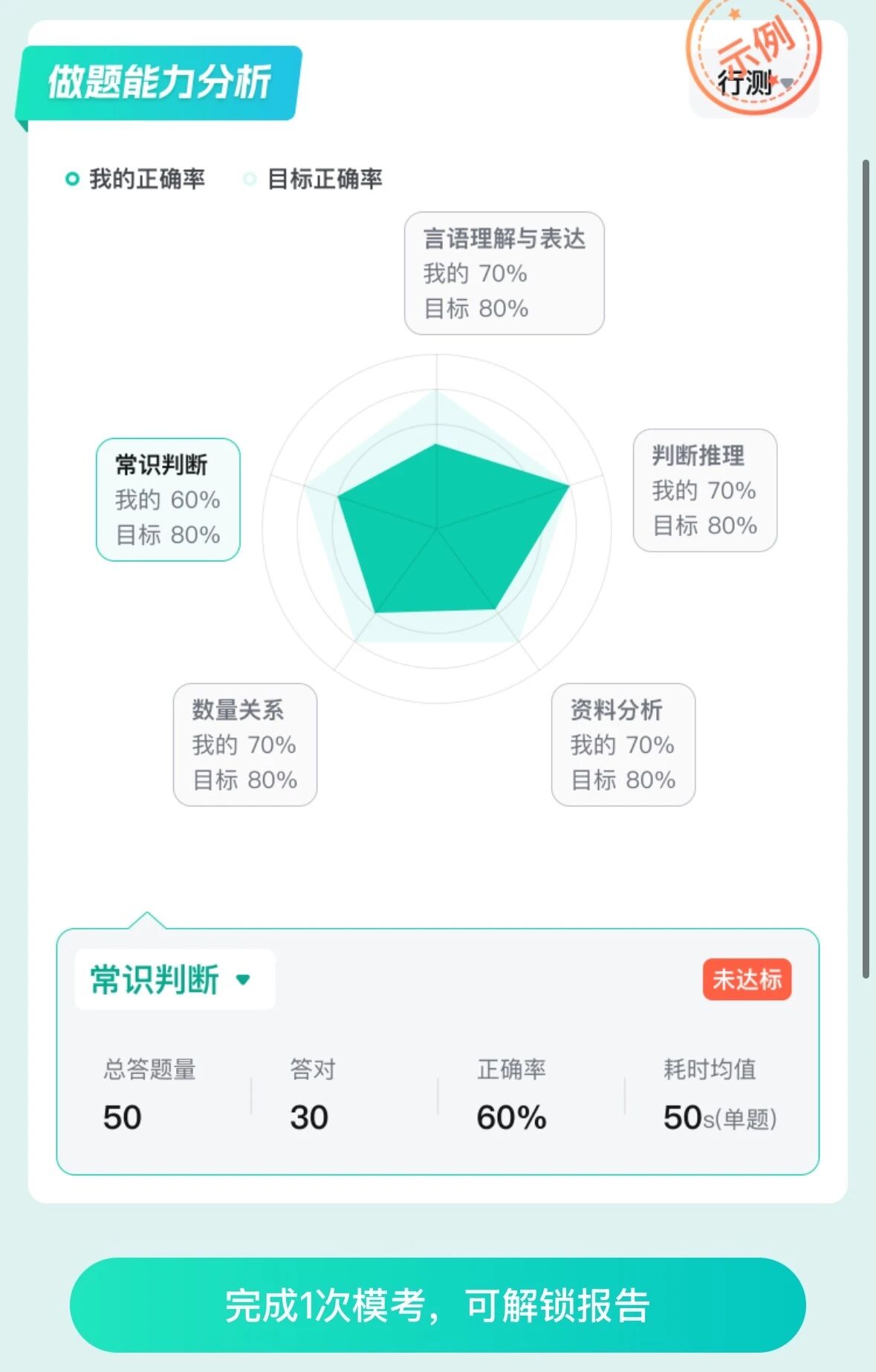 3??生成個人模考報告:考完就能查看??汲煽?、排名及解析,生成的個人模考報告包含各模塊正確率分布、做題能力分析、筆試分數(shù)yu測等內(nèi)容。