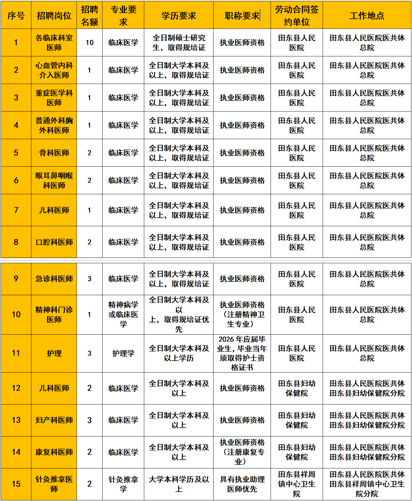 本次招聘是田東縣人民醫(yī)院醫(yī)共體總院根據(jù)總院、各分院的人才需求情況統(tǒng)一招聘,被錄用人員根據(jù)具體工作地點(diǎn)與相應(yīng)分院或總院簽訂勞動(dòng)合同,被錄取人員的薪酬、福利待遇由相應(yīng)的分院或總院按同類型人員發(fā)放。具體招聘崗位詳見附件:《2026年田東縣人民醫(yī)院醫(yī)共體