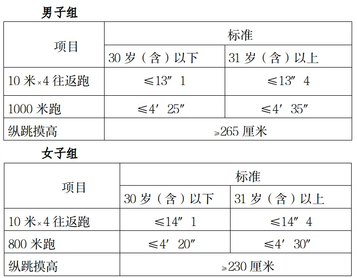 測評結(jié)果分為合格和不合格。一般體能測評三項(xiàng)成績均達(dá)標(biāo)的方為合格,其中具有研究生及以上學(xué)歷報(bào)考人員,體能測評三個(gè)項(xiàng)目中有任何兩項(xiàng)達(dá)標(biāo)的,即視為合格。體能測試時(shí)間、地點(diǎn):另行通知。