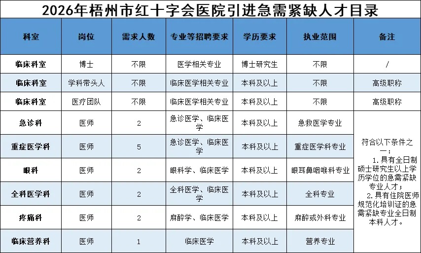 符合條件者享受梧州市高層次(緊缺)人才引進(jìn)政策和梧州市紅十字會醫(yī)院急需緊缺人才引進(jìn)政策,提供事業(yè)單位編制及安家費: