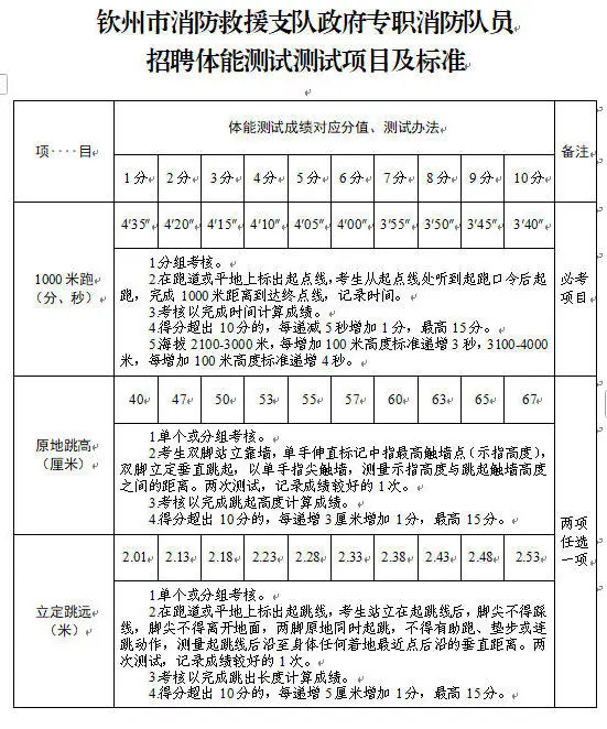 2.體能測試:(1)必考項(xiàng)目:1000米跑;(2)選考項(xiàng)目:①立定跳遠(yuǎn)、原地跳高二選一;②單杠引體向上、俯臥撐二選一;③10米×4往返跑、100米跑二選一;(3)注意事項(xiàng):體能測試有兩項(xiàng)及兩項(xiàng)以上不得分的視為不合格(標(biāo)準(zhǔn)參照附件)。未按時(shí)參加或因身體原因無法測試者,視為自動(dòng)放棄。