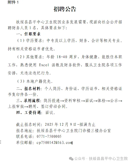 原文標(biāo)題:2025年崇左扶綏縣昌平中心衛(wèi)生院公開招聘財(cái)務(wù)工作人員1人