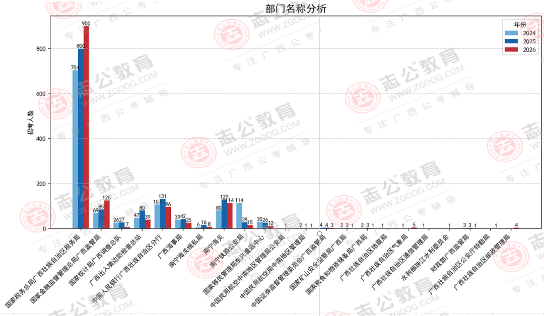 在今年,廣西國(guó)稅系統(tǒng)這個(gè)招考“大戶”,招錄漲到了900人,職位數(shù)占比66%。此外,國(guó)家金融監(jiān)督管理總局廣西監(jiān)管局招125人,呈正增長(zhǎng),與2025年國(guó)考相比漲幅47%。南寧海關(guān)從2025年招錄129人,2026年只招錄114人,相比縮減了11.63人。