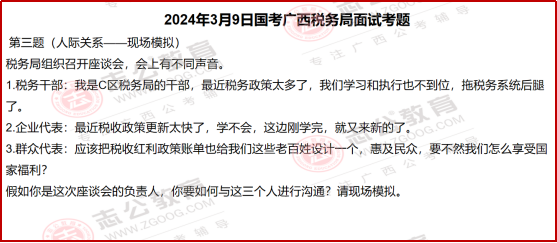 3??人際關(guān)系題:以 “座談會(huì)現(xiàn)場(chǎng)模擬” 的形式,直接還原稅務(wù)工作中的溝通場(chǎng)景 —— 既要回應(yīng)干部的 “政策學(xué)習(xí)壓力”,也要解決企業(yè)的 “政策更新焦慮”,還要滿足群眾的 “紅利獲得感訴求”,考察的是 “換位思考 + 實(shí)務(wù)解決能力”。