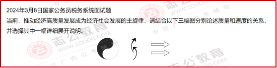 再來(lái)看2024年3月8日的 “質(zhì)量與速度” 題,更是結(jié)合經(jīng)濟(jì)政策 + 稅務(wù)職能,要求用 “太極圖” 等符號(hào)具象化論述,體現(xiàn)了 “稅務(wù) + 宏觀政策” 的復(fù)合考察。