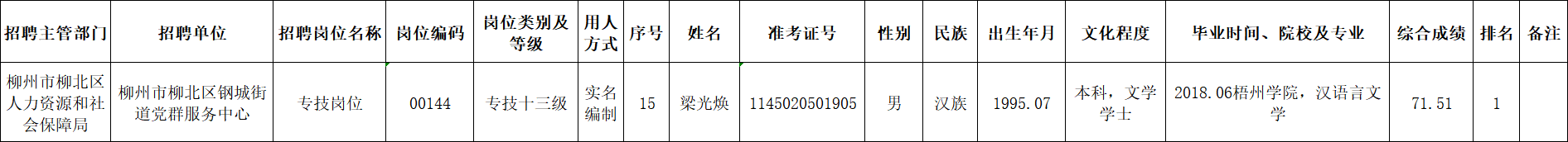 根據《柳州市2025年度下半年事業(yè)單位公開考試招聘工作人員公告》要求及安排,梁光煥同志經面試、考察、體檢合格,符合聘用條件。經研究決定,擬聘用梁光煥同志為我區(qū)事業(yè)單位工作人員,現予以公示,公示期為5個工作日(2026年1月22日至2026年1月28日)。對擬聘用的同志如有異議,請以書面形式,并署真實姓名和聯系地址,于2026年1月28日前郵寄或直接送我單位(地址:柳州市勝利路12-8號柳北區(qū)政府4樓417室;郵編:545002,電話0772-2513360),群眾如實反映有關問題受法律保護。