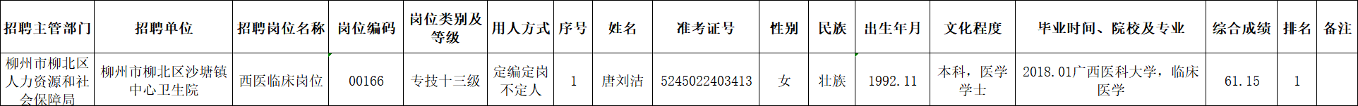 根據(jù)《柳州市2025年度下半年事業(yè)單位公開(kāi)考試招聘工作人員公告》要求及安排,唐劉潔同志經(jīng)面試、考察、體檢合格,符合聘用條件。經(jīng)研究決定,擬聘用唐劉潔同志為我區(qū)事業(yè)單位工作人員,現(xiàn)予以公示,公示期為5個(gè)工作日(2026年1月22日至2026年1月28日)。對(duì)擬聘用的同志如有異議,請(qǐng)以書(shū)面形式,并署真實(shí)姓名和聯(lián)系地址,于2026年1月28日前郵寄或直接送我單位(地址:柳州市柳北區(qū)鷓鴣江六隊(duì)南200米(北外環(huán)路南)柳北區(qū)衛(wèi)生健康局512室;郵編:545002,電話(huà)0772-2802642),群眾如實(shí)反映有關(guān)問(wèn)題受法律保護(hù)。