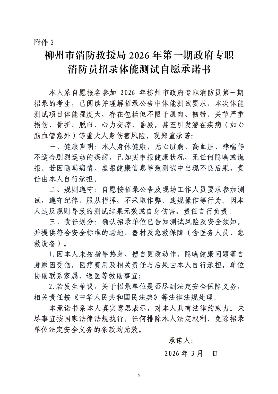 考生在體能測評(píng)前需簽署體能柳州市政府專職消防員第一期招錄體能測試承諾書,拒絕簽署的不予進(jìn)行考核詳見(附件2)。