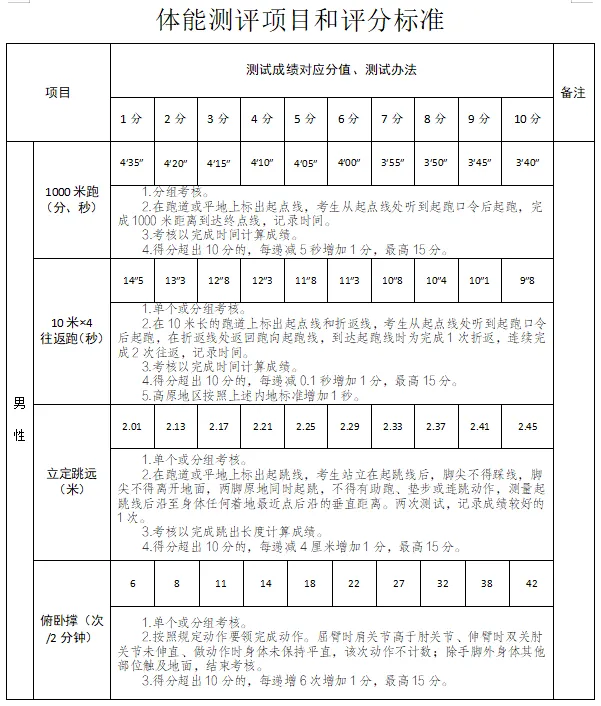 任一單項(xiàng)得分為0的視為“不合格”,予以淘汰。體能測評(píng)所有項(xiàng)目均只測試一次。(標(biāo)準(zhǔn)見附件)