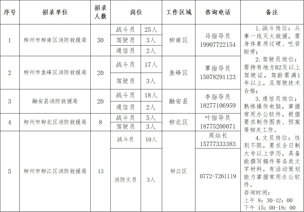 政府專職消防員91人。崗位要求:男性,身高165CM以上,雙眼裸視力4.8以上,需具備高中(中專)以上學(xué)歷,年齡為18-28周歲以下(有部隊(duì)服役經(jīng)歷或者全日制大專及以上學(xué)歷可放寬至30周歲),身體素質(zhì)過硬、吃苦耐勞、心理健康,無遺傳性、傳染性和慢性疾病,符合體檢標(biāo)準(zhǔn)。