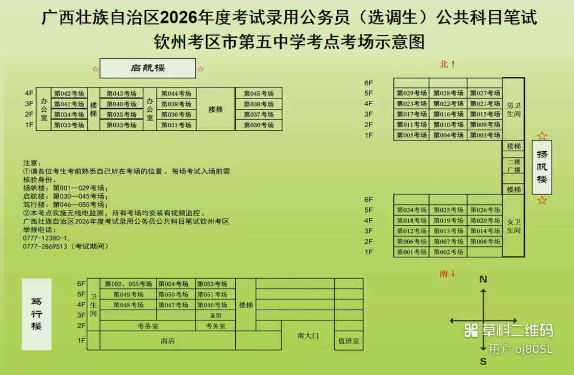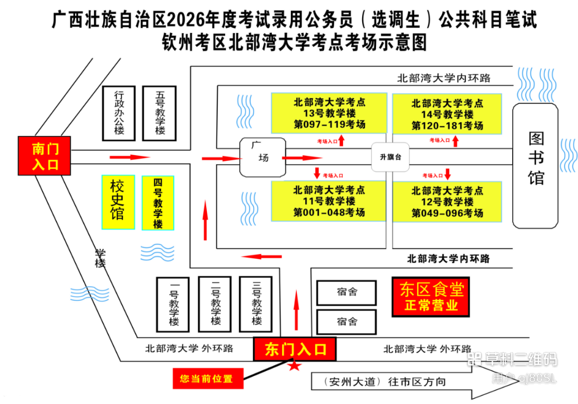 欽州考區(qū)共設(shè)三個考點,分別為北部灣大學(xué)考點、北部灣職業(yè)技術(shù)學(xué)??键c、欽州市第五中學(xué)考點。(考點地址和具體考場安排請掃附后的二維碼查看)