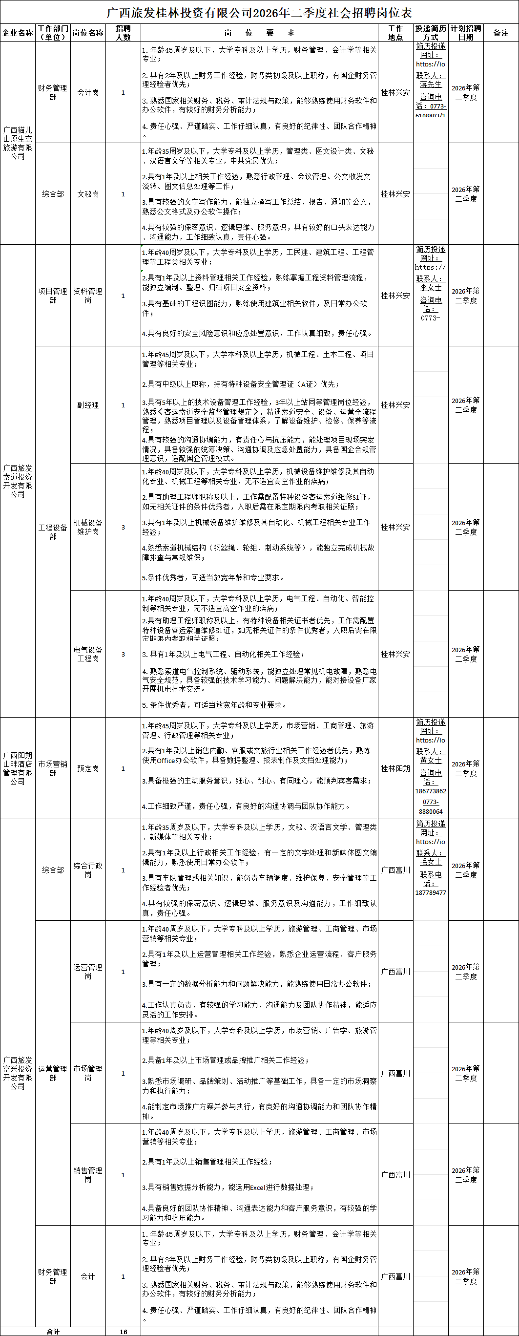 廣旅桂林投資公司有關崗位員工16名(詳見附件1)。